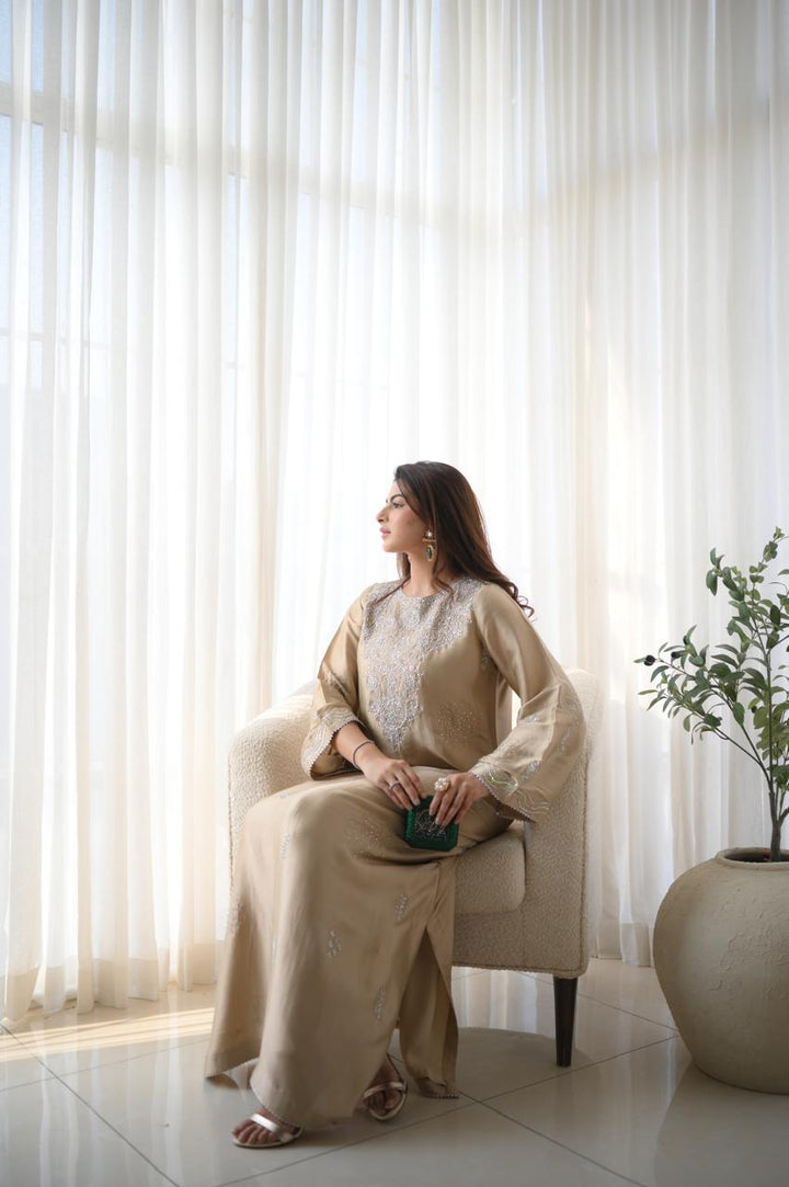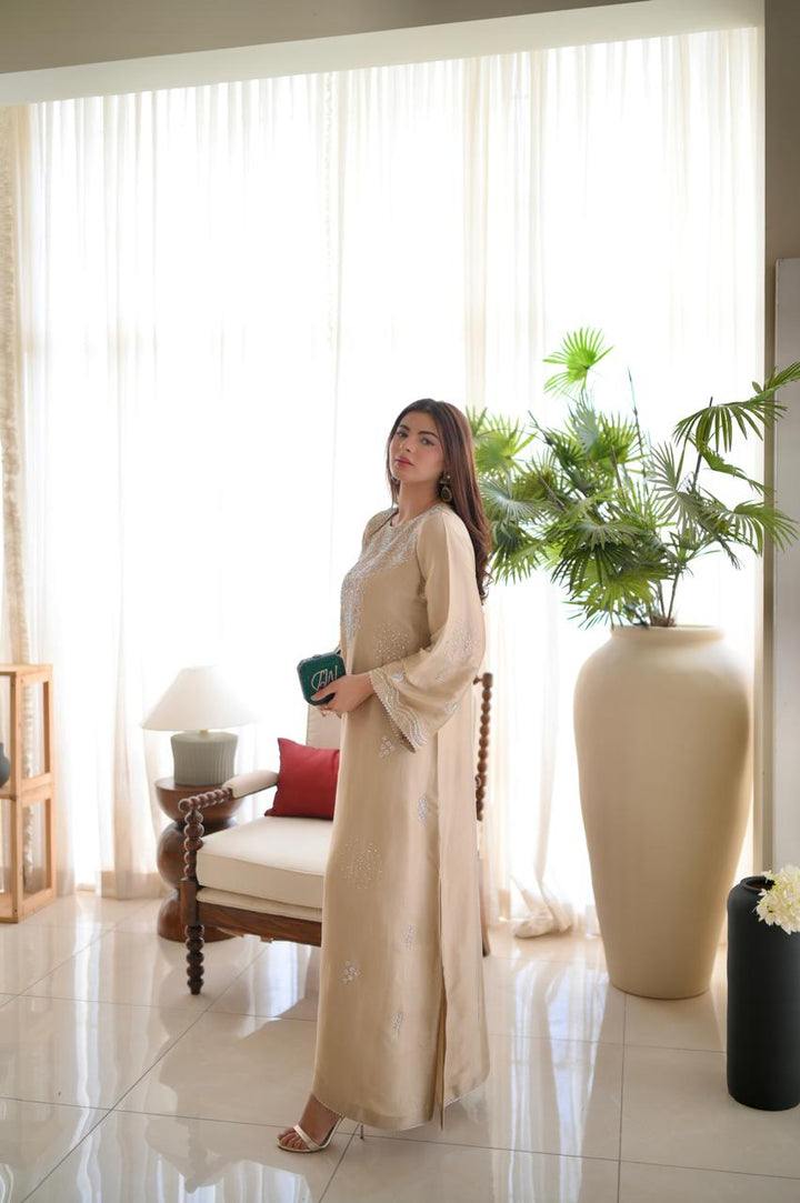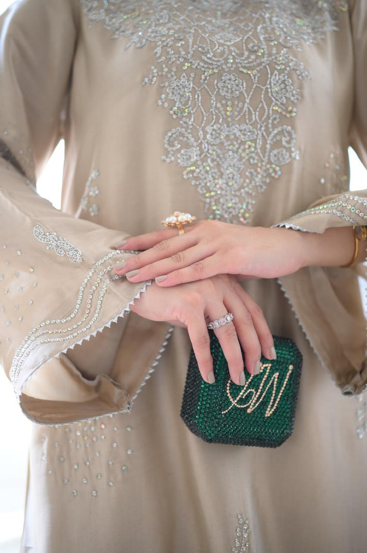 Introducing the "Mumtaz Kaftan", a regal ensemble exuding poise and grace, rendered in pure Sheesha silk with an attached lining for a seamless fall. Paired with Pakistani silk pants and a scalloped pure organza dupatta, this kaftan is fully hand-embellished with exquisite Swarovski crystals and kutt daana detailing, celebrating the charm of artisanal craftsmanship and classic elegance.