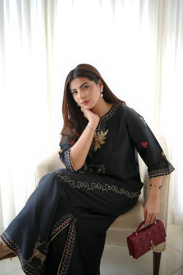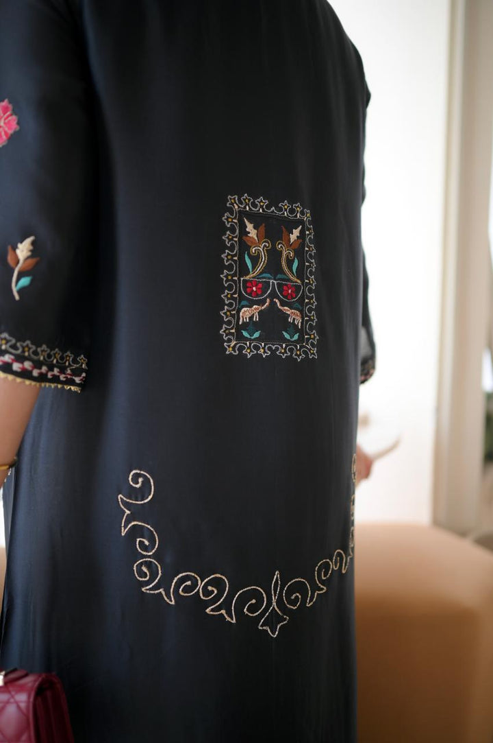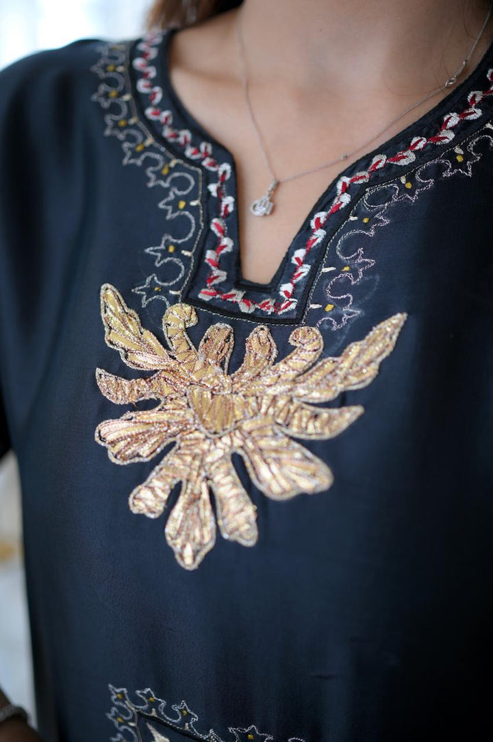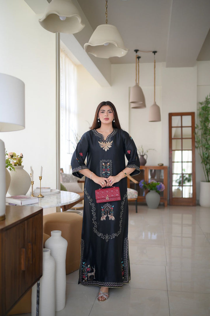 Introducing the “Nayab Kaftan”, an exquisite ensemble that celebrates timeless Mughal artistry. Crafted with delicate embroidery inspired by regal Mughal motifs, this kaftan is accentuated with golden zari detailing that adds a subtle shimmer and luxurious charm. Standard length of kaftan is 56 inches. Fabric: Sheesha Silk kaftan kaftan comes with a pakistani rawsilk pant if taken as two piece. Customisation Options:Can also be customised into a shirt and pants set. Additional charges apply for changing pant fabric.