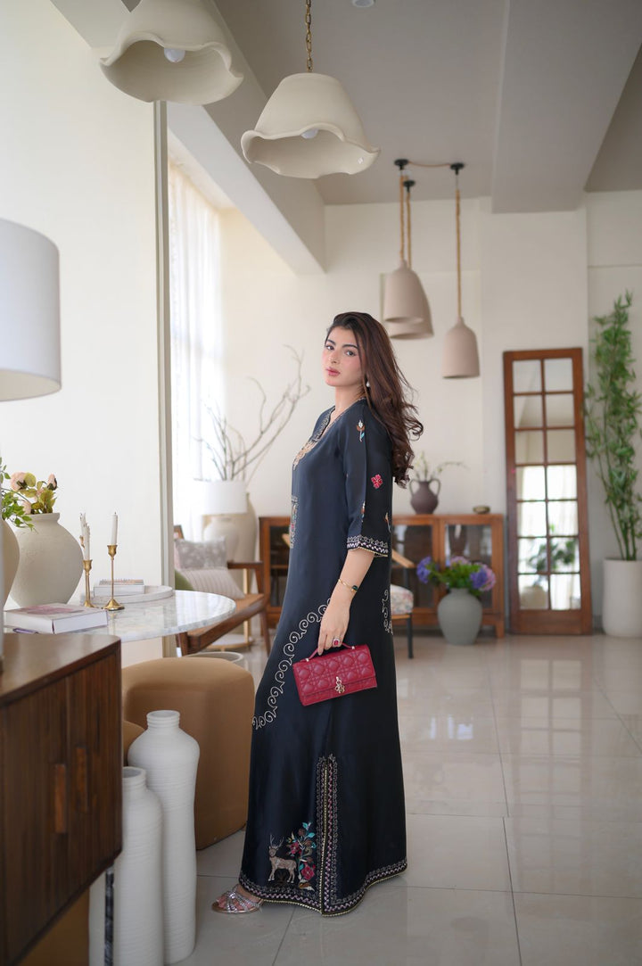 Introducing the “Nayab Kaftan”, an exquisite ensemble that celebrates timeless Mughal artistry. Crafted with delicate embroidery inspired by regal Mughal motifs, this kaftan is accentuated with golden zari detailing that adds a subtle shimmer and luxurious charm.